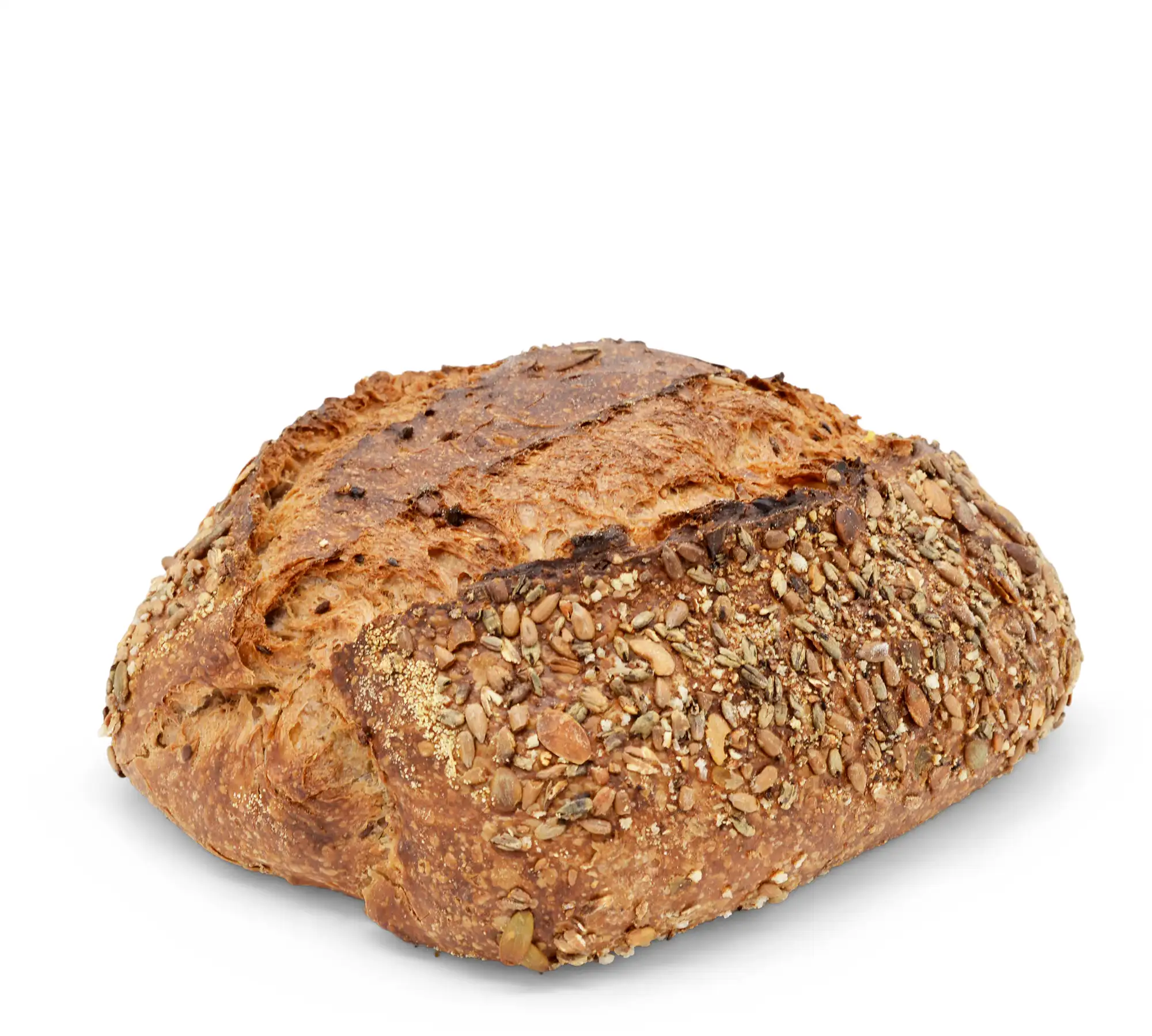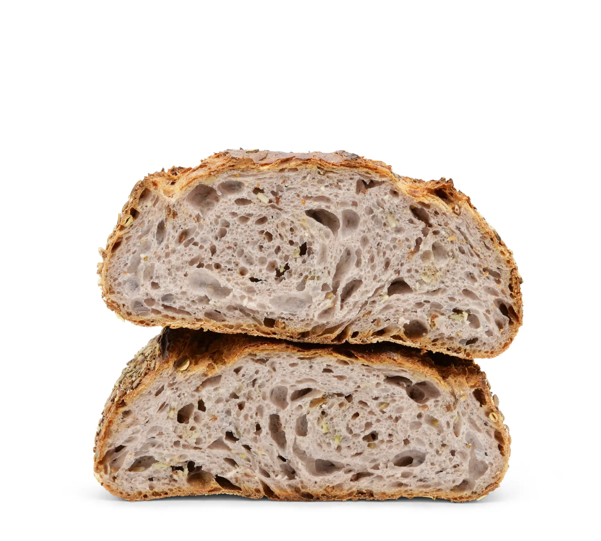 Dinkelmehl, Type 630 (Weizenmehl (Dinkel), Wasser, Roggenmehl, schwarzes Johannisbeerpüree, Kürbiskerne, Sonnenblumenkerne, Meerspeisesalz, Roggenmalzflocken, Rapsöl, Sesamsamen, Leinsamen, Hafervollkornflocken, Hefe, Rohrzucker, Gluten aus Weizen, Sojabohnen, Hirse, Chiasamen (Salvia hispanica)